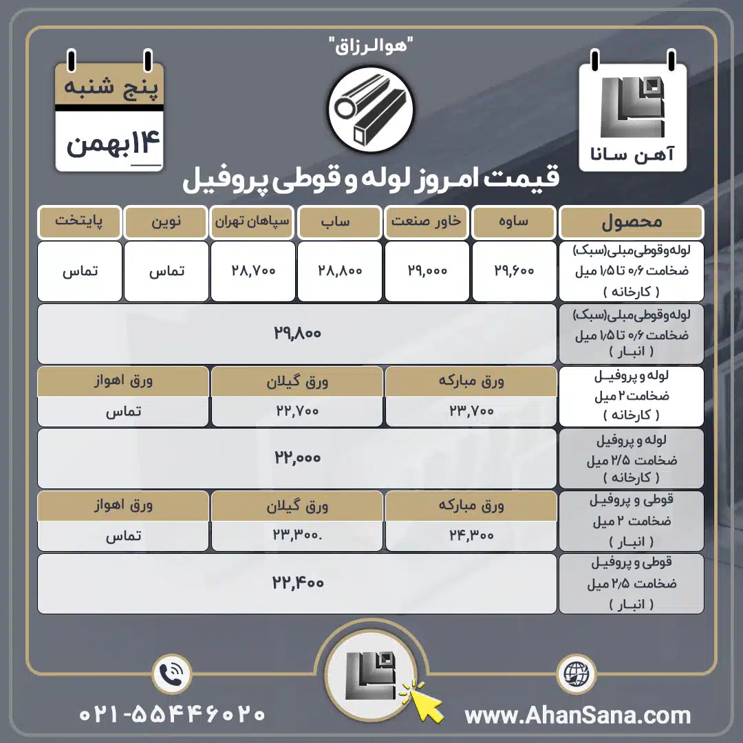 برای استعلام قیمت روز پروفیل باید به یک منبع مطمعن و موثق مراجعه کرد ، سایت آهن سانا یکی از این منابع است که مشتریان گرامی را در خرید این محصول میتوانند راهنمایی نمایند